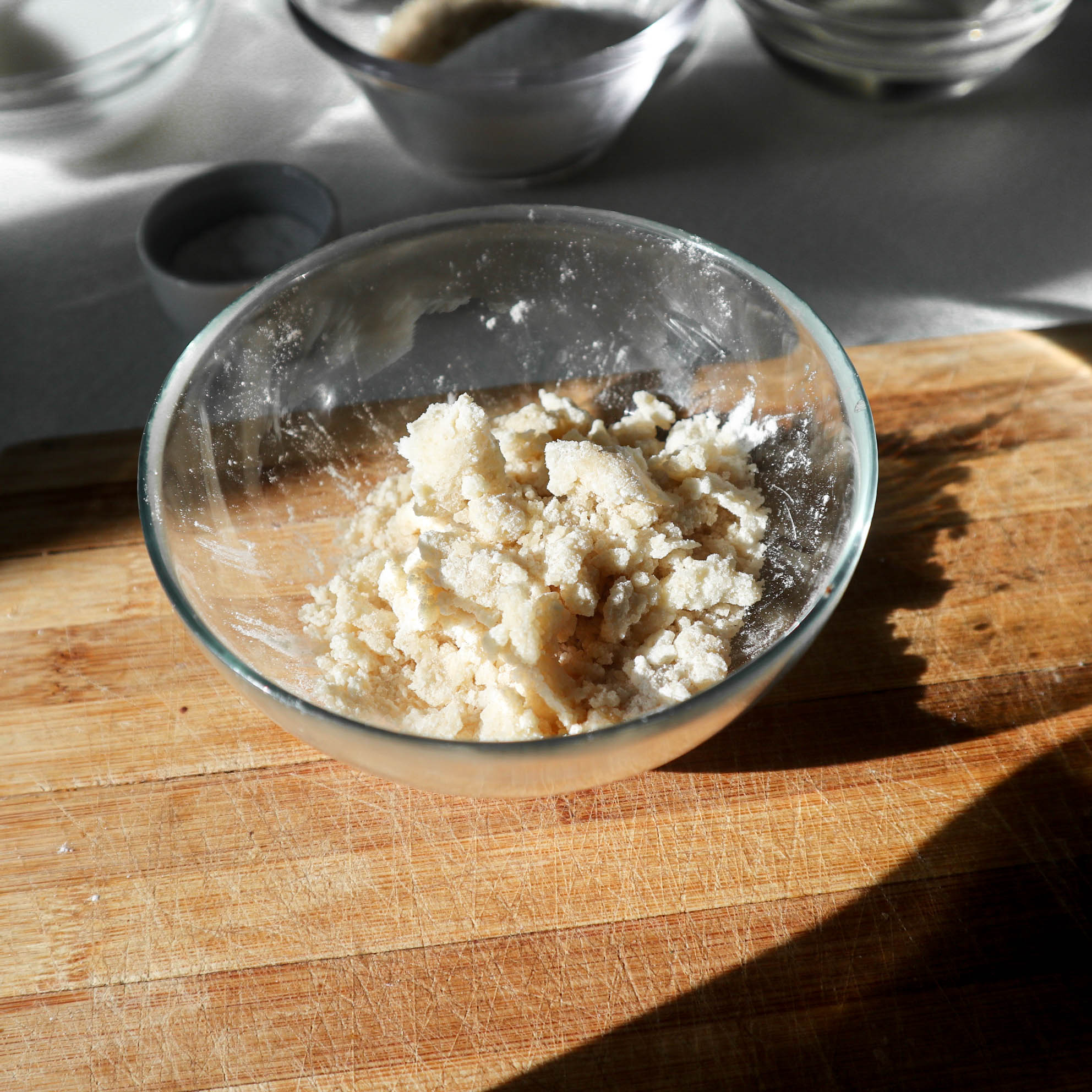 Per prima cosa prepariamo il crumble, in una ciotolina raduniamo le polveri e poi aggiungiamo il burro freddo tagliato a tocchetti. Con la punta delle dita, andiamo a creare delle piccole briciole, che andremo poi a sistemare in frigo.