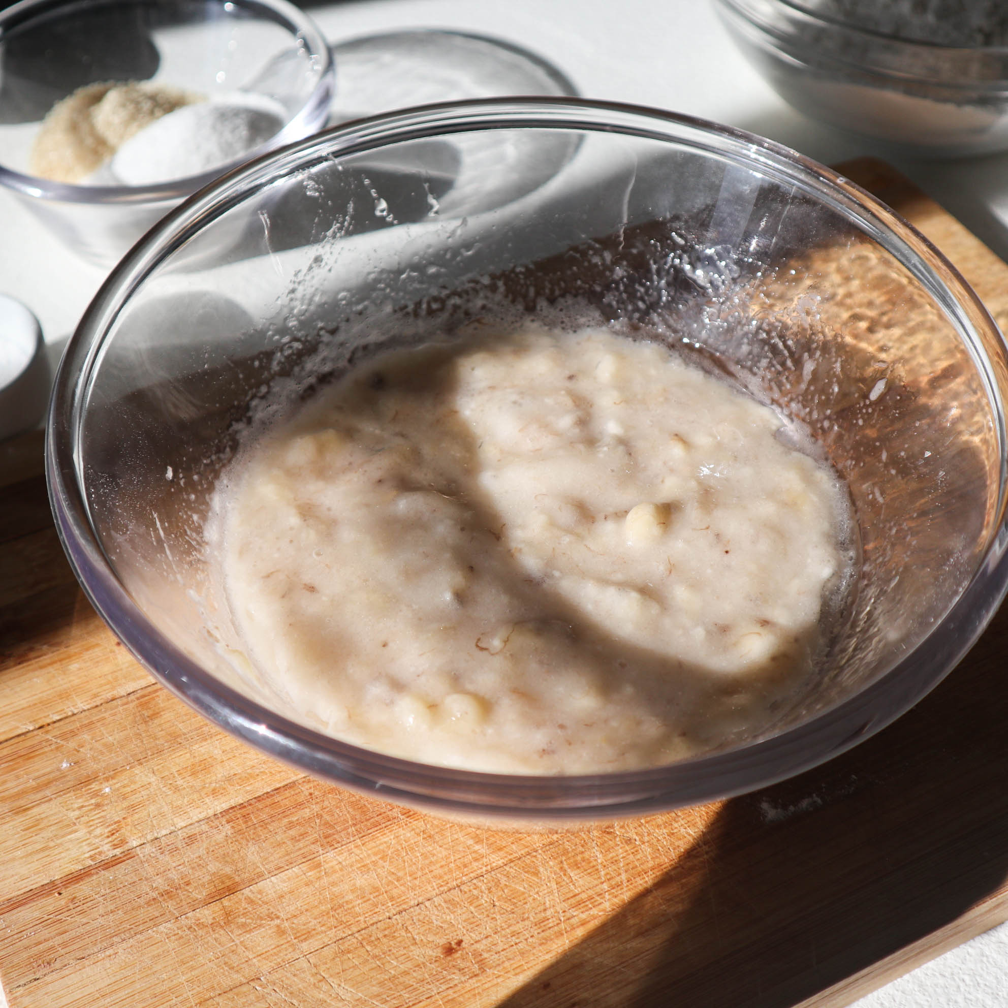 In una ciotola capiente, schiacciamo le banane con una forchetta, sino ad ottenere una pappa senza pezzettoni di frutta. Aggiungiamo l’olio, il latte e l’aceto, usando la forchetta per rimestare il tutto sino ad ottenere un composto liscio.
