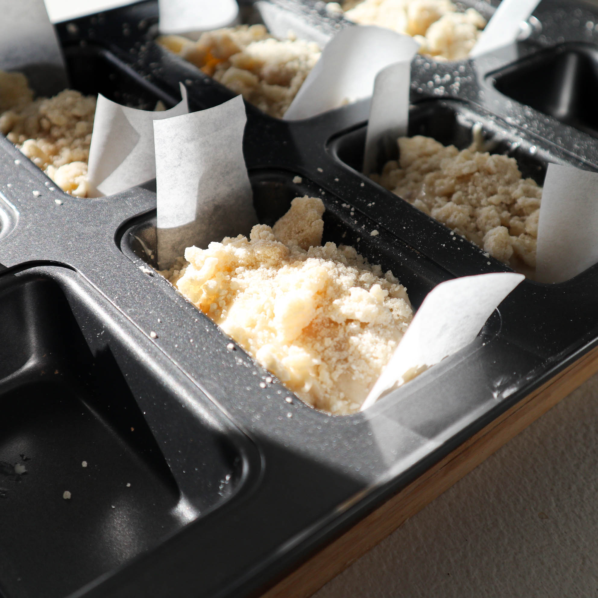 Ora, se usate la teglia per muffin, vi raccomando di usare dei pirottini più alti, così che possiate riempirli sino all’orlo. Io ho usato la mia teglia per i mini plum cake, con una striscia di carta forno per poterli tirare fuori più facilmente. Io per scrupolo, imburro ed infarino gli stampini. Con uno spallinatore da gelato o con un cucchiaio, dividiamo l’impasto in sei parti nella nostra teglia. Copriamo col nostro crumble freddo di frigo.