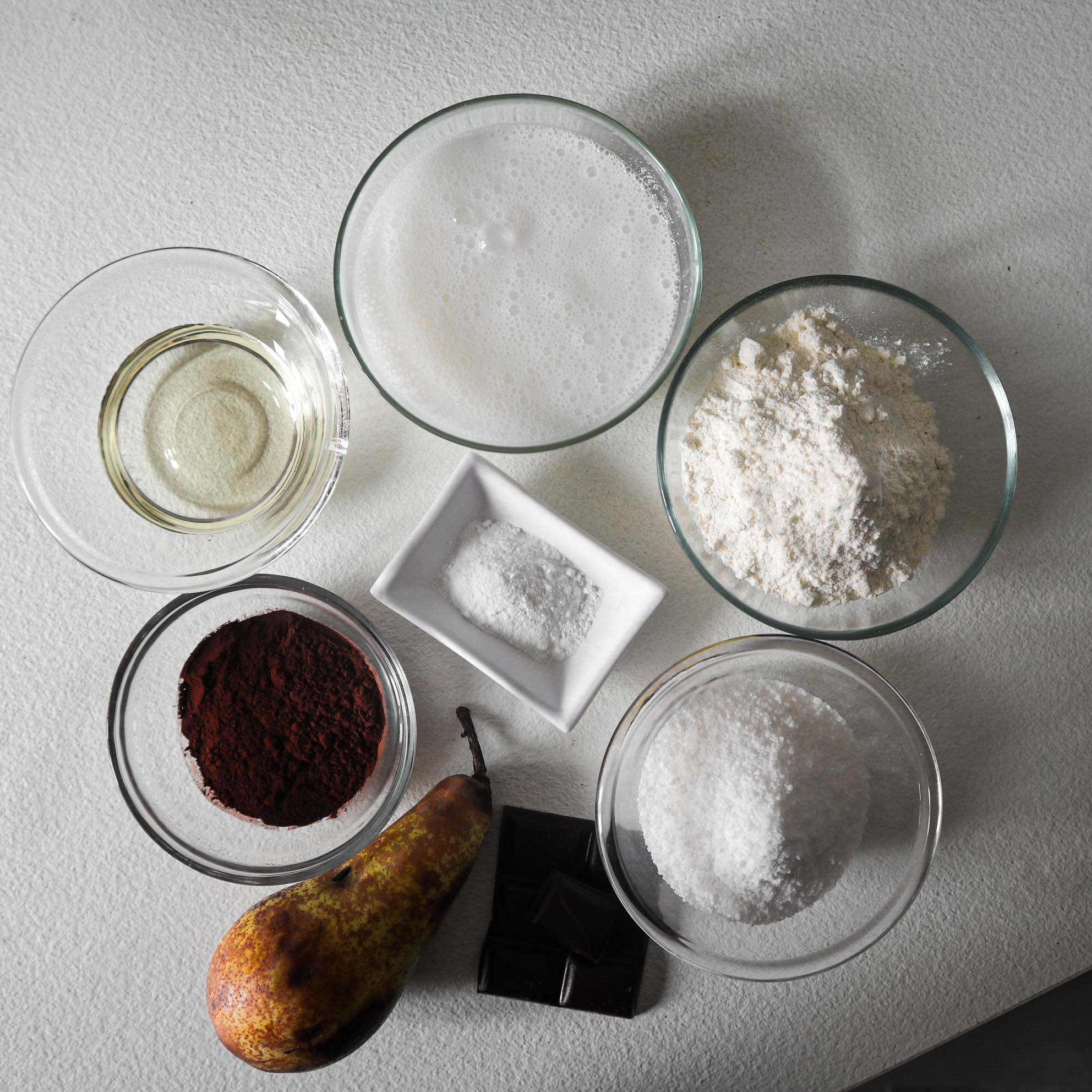 In una ciotola raduniamo farina, lievito, cacao e zucchero. Tagliamo la pera a tocchetti ed il cioccolato a pezzetti.